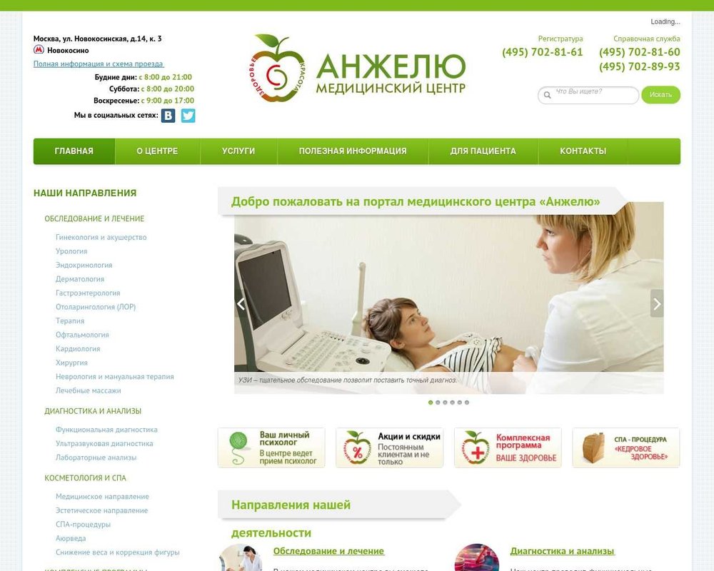 Медицинский центр Анжелю - это учреждение широкого профиля, предлагающее специально подобранный комплекс процедур и услуг для каждого клиента. Работа клиники организована с учетом максимального комфорта для посетителей. Техническое оснащение кабинетов позволяет провести диагностические исследования организма пациента для составления программы лечения и профилактических мероприятий. В клинике функционируют отделения общей терапии, кардиологии, гастроэнтерологии, аллергологии, иммунологии, гематологии, неврологии, эндокринологии, дерматологии, урологии, колопроктологии, гинекологии, акушерства, маммологии, психотерапии, оториноларингологии, ортопедии. Наши врачи имеют высокую квалификацию и с пониманием отнесутся к вашим проблемам. Доверяя заботу о своем здоровье нам, вы можете быть уверены в результате. Также мы сможем помочь с выбором подходящей диеты.